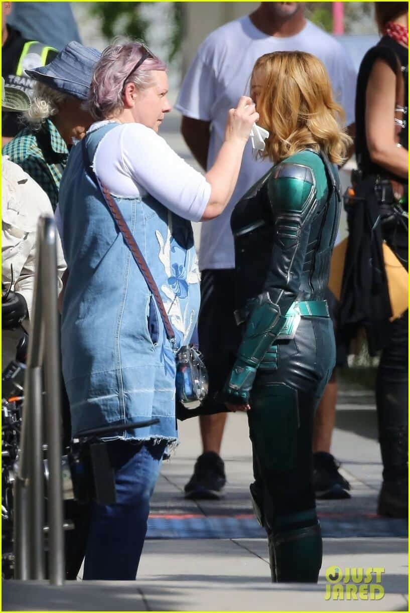 Brie Larson era precedentemente apparsa in un video dal set di Captain Marvel, che anticipava una scena sul tetto di un treno, e ora l’attrice premio Oscar torna protagonista di alcuni scatti dietro le quinte del cinecomic. Le immagini ritraggono la star in un momento di pausa tra una scena e l’altra, mentre le viene sistemato il trucco; l’interprete appare sempre nel costume verde e con le riprese ormai in corso da mesi, è probabile che la supereroina indosserà questa versione del completo praticamente per tutto il film.