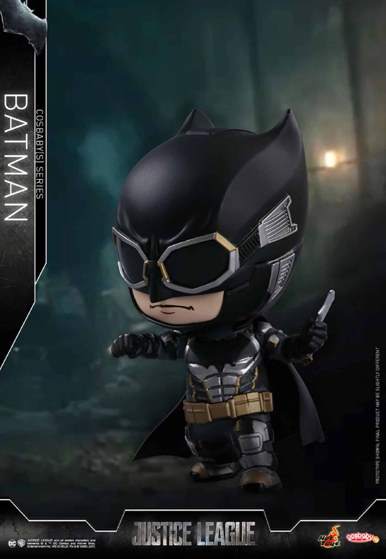 Inoltre, Hot Toys ha svelato anche altre due Cosbaby Figures, che prevedono una versione dipinta in colori metallici di Batman e The Flash. Queste mini action figures sono alte quasi come le precedenti, circa 11 cm.