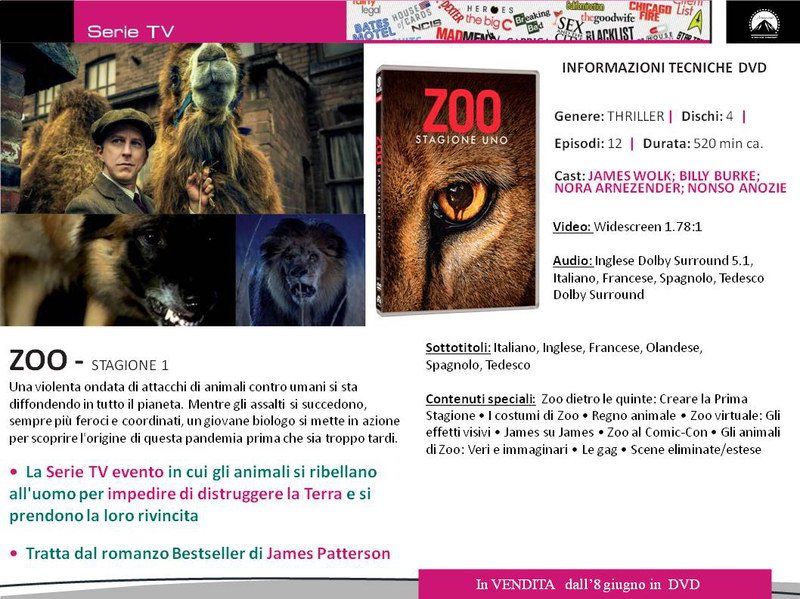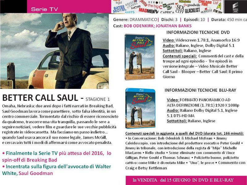 Quali sono le serie tv in DVD proposte da Universal Pictures nel mese di giugno 2016? In primis dall’8 giugno escono: la prima stagione di Zoo, basato sul feroce attacco da parte degli animali, riuscirà il giovane biologo protagonista a contrastarlo? Sempre dall’8 è disponibile la Convent Affairs 5, una delle Serie Tv più apprezzate e seguite del panorama televisivo mondiale è giunta al termine. Preparatevi a vivere una stagione finale ricca di suspense e colpi di scena. Tra nuovi incontri, vecchi nemici e pericolose indagini, riuscirà Annie a trovare Khalid Ansari? Assolutamente da non perdere la prima stagione di Better Call Saul, in uscita il 15 Giugno; lo spin off di Walter White e soci, che non è mai stata trasmessa in TV. I fatti narrati nella serie hanno come set il Nebraska e avvengono due anni dopo gli avvenimenti raccontati in Breaking Bad; Saul Goodman lavora come panettiere, sotto falsa identità, in un centro commerciale. Tormentato dal rischio di essere riconosciuto da qualcuno, trascorre una vita tranquilla, passando le sere a seguire notiziari, vedere film e guardare le sue vecchie pubblicità registrate in videocassetta. Ma facciamo un passo indietro… quando Saul usava ancora il suo nome legale, James McGill,e cercava in tutti i modi di affermarsi come avvocato penalista.