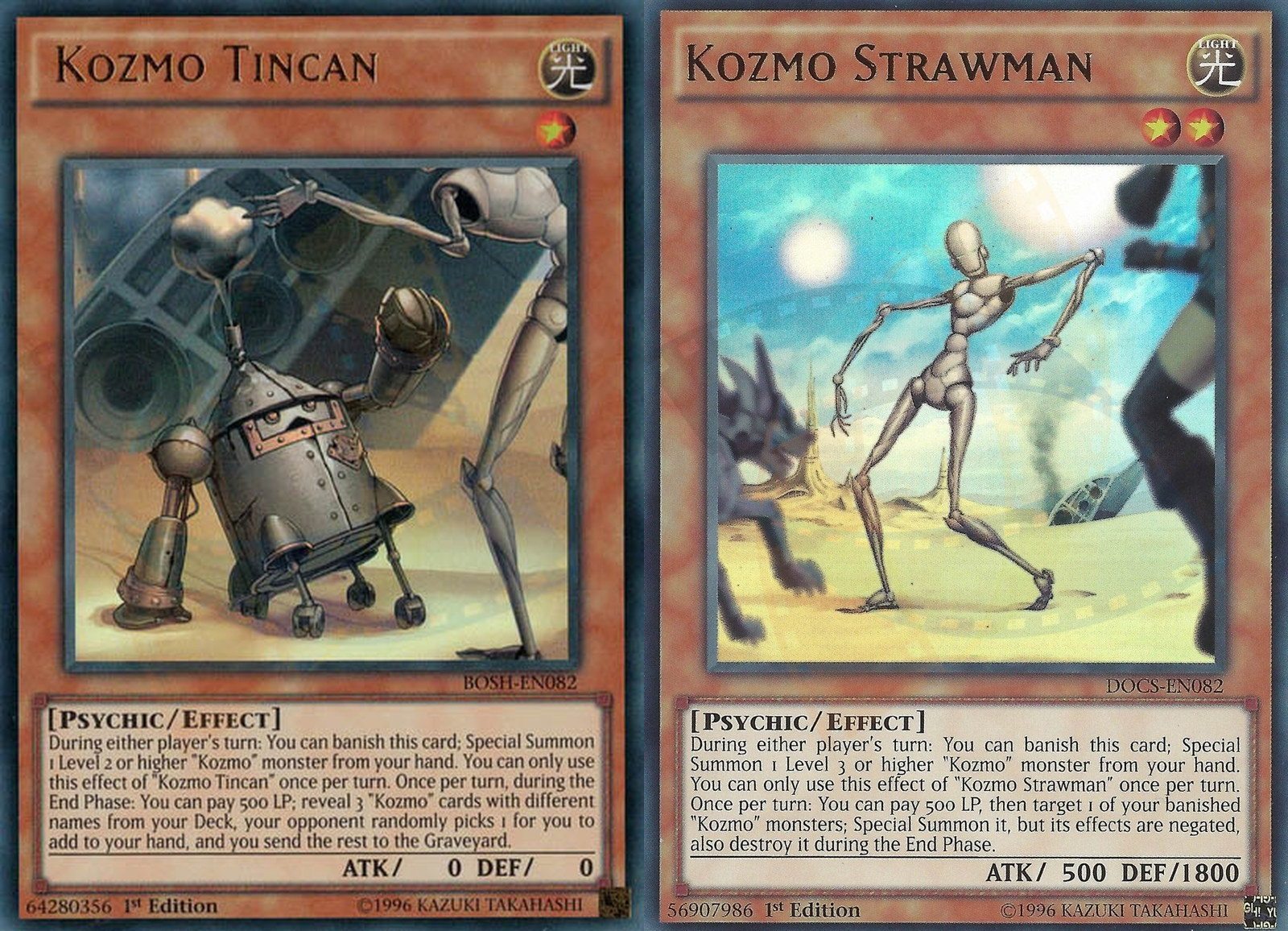 Non poteva mancare la versione fatta carta dei 2 droidi che sanno solo creare guai. Ispirati ai simpaticissimi R2-D2 e C-3PO arrivano anche Kozmo Lattina (in inglese Kozmo Tincan) e Kozmo Fantoccio (in inglese Kozmo Strawman) che sono pronti ad entrare nel deck di tutti i duellanti.