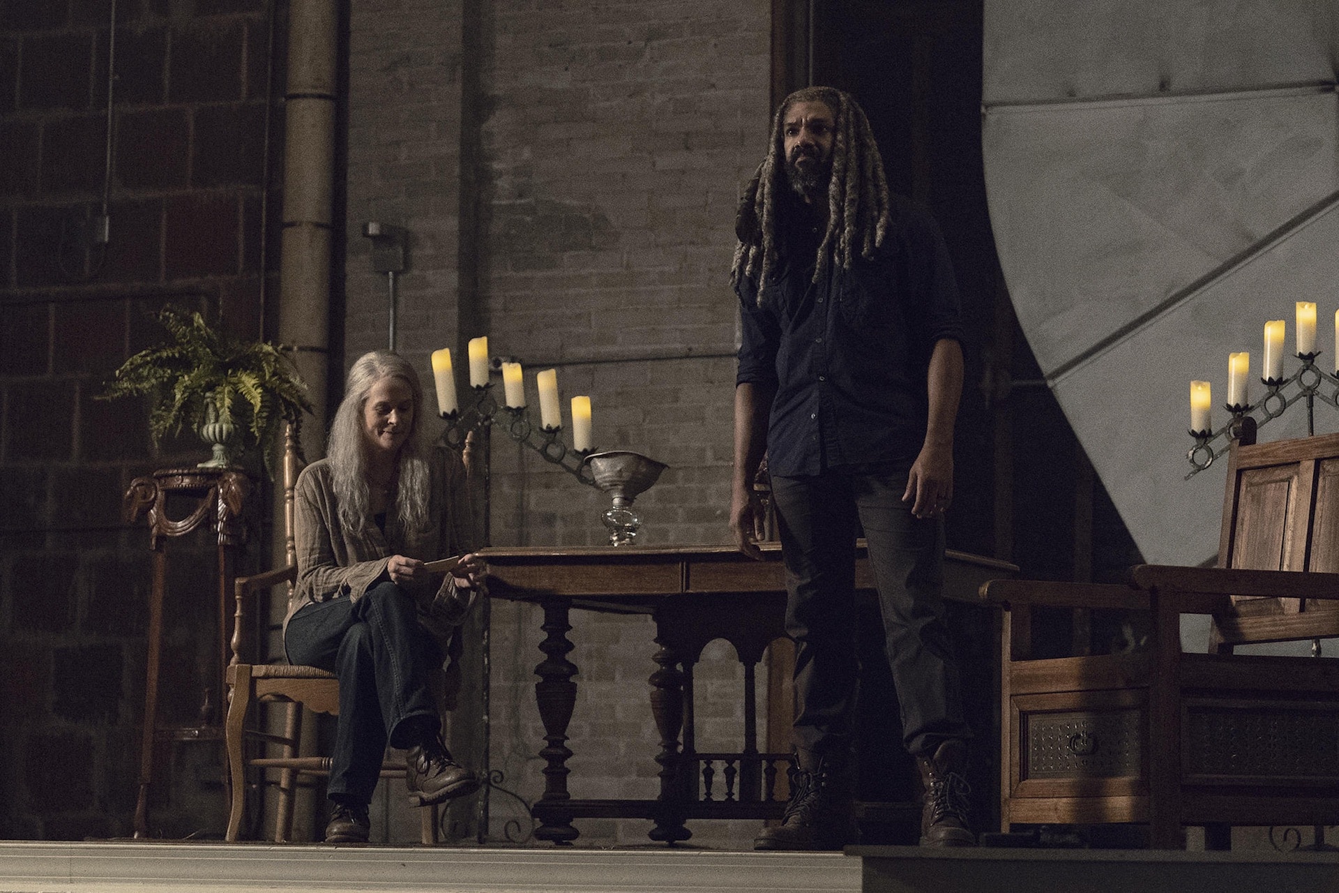 Nessuna delle foto rilasciate contiene Sussurratori certificati, ma ecco cosa sappiamo di come sono fatti. L’immagine seguente – ad esempio – è della première di metà stagione e presenta Michonne (Danai Gurira) che si prepara a scatenarsi su alcuni Camminatori su un ponte coperto. Questi potrebbero essere Sussurratori o normali zombie…